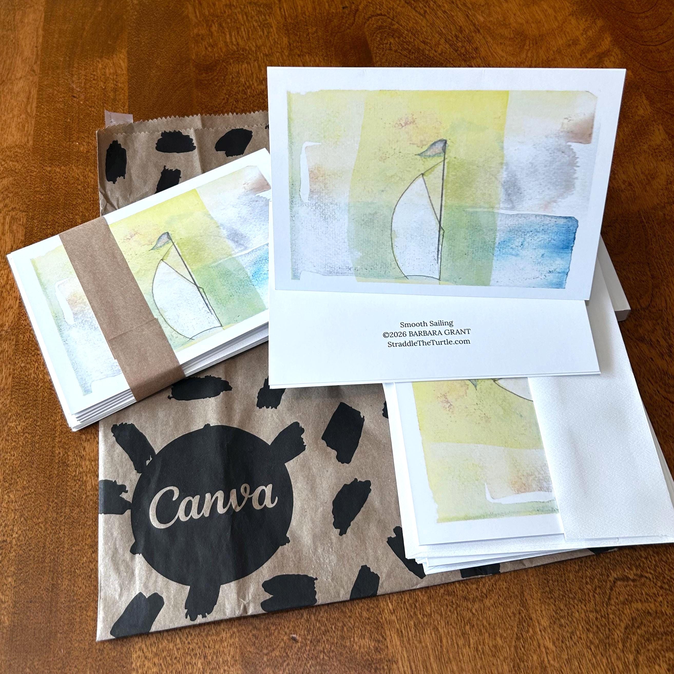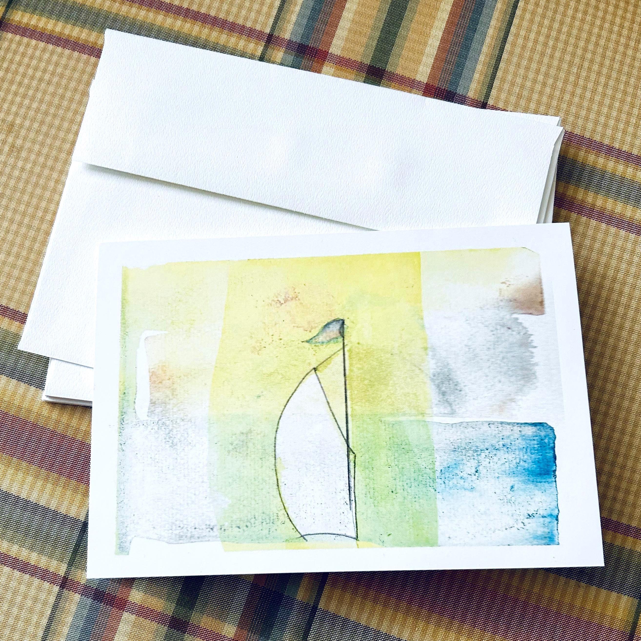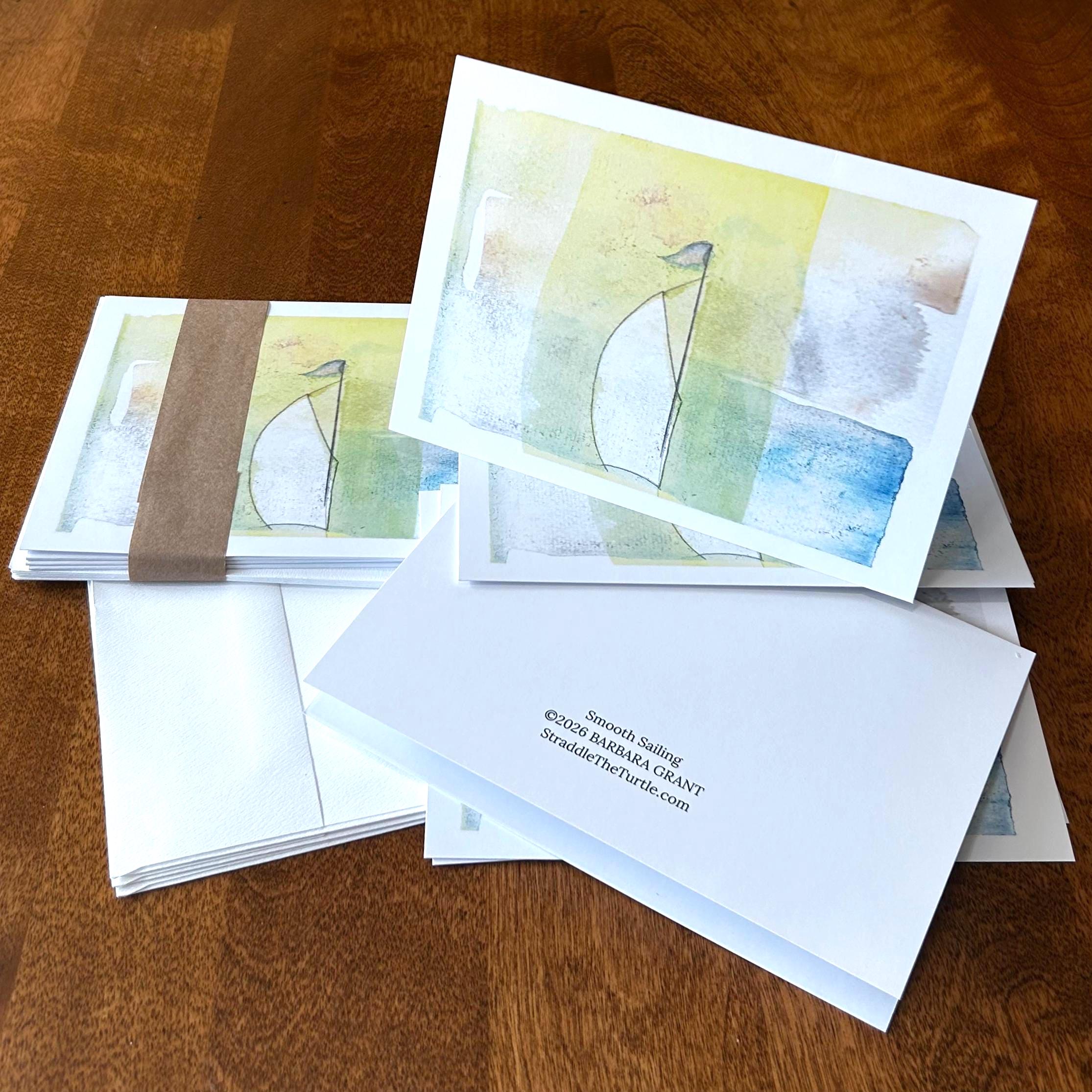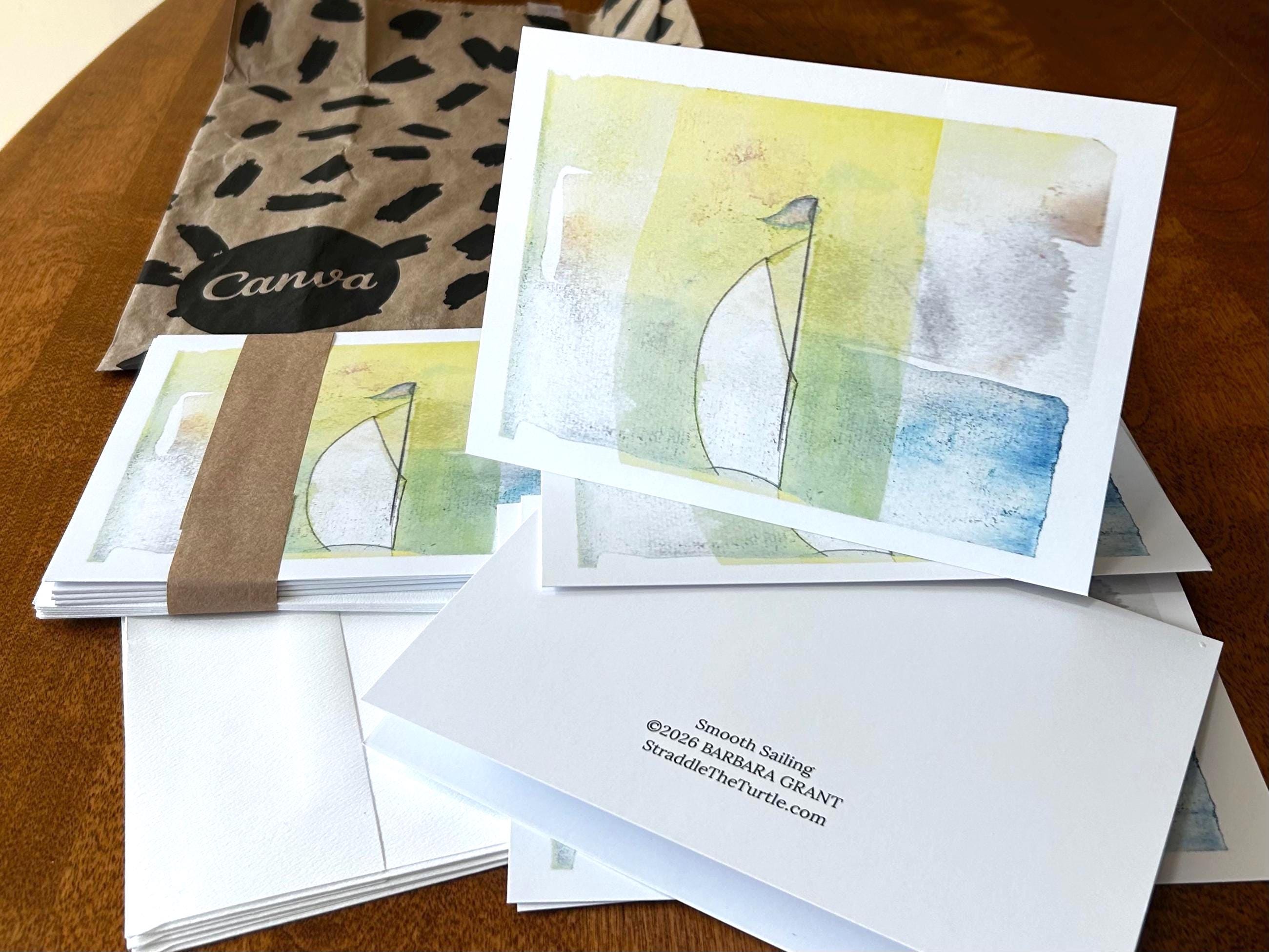 Sailboat greeting cards, $5 each or set of 6 for $28. Blank inside premium paper, matte finish, 5 x 7 inch with plain white envelopes. Professionally printed for me by Canva from the photograph of my original loose watercolor rendering in pastel hues. Entitled "Smooth Sailing"