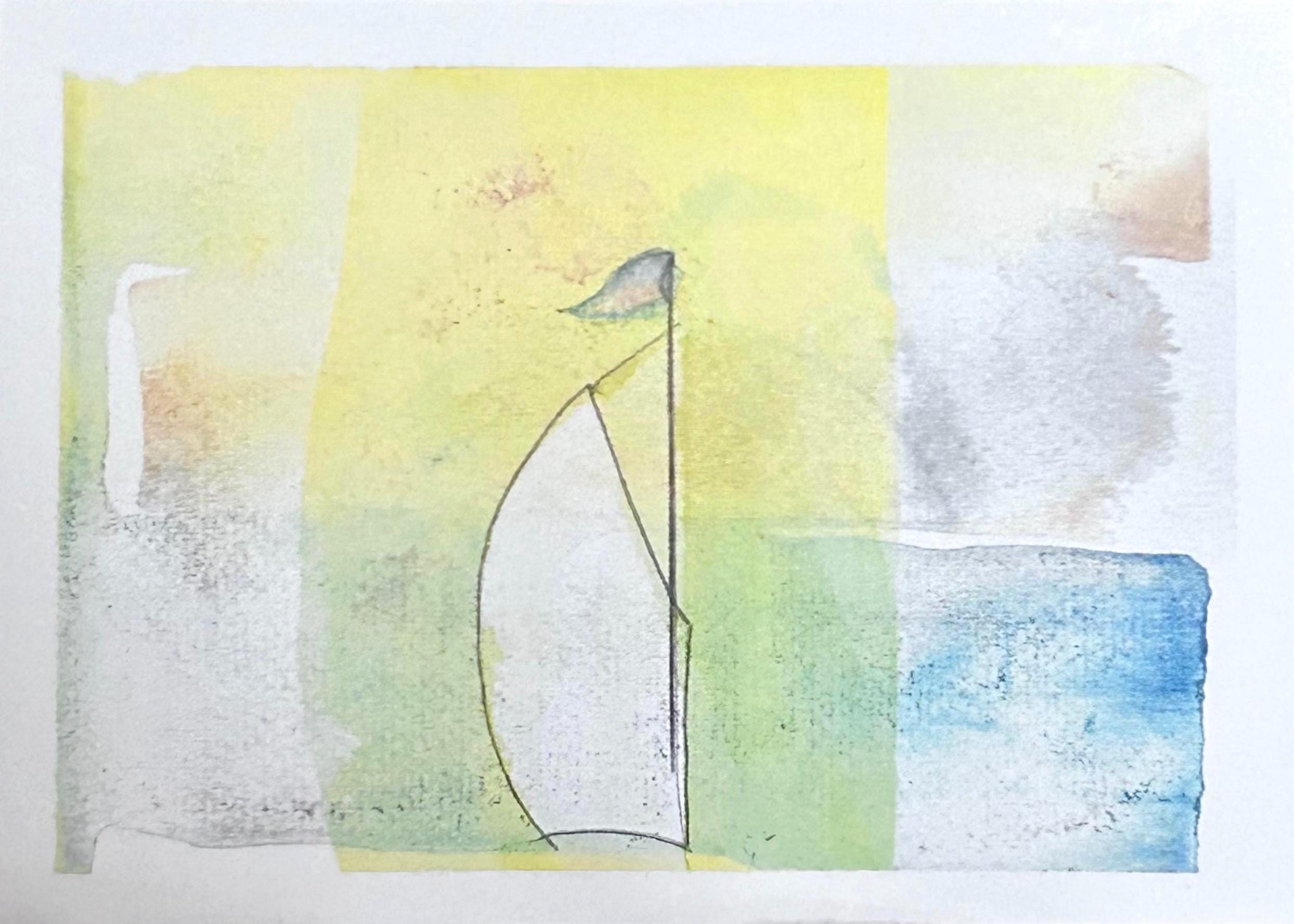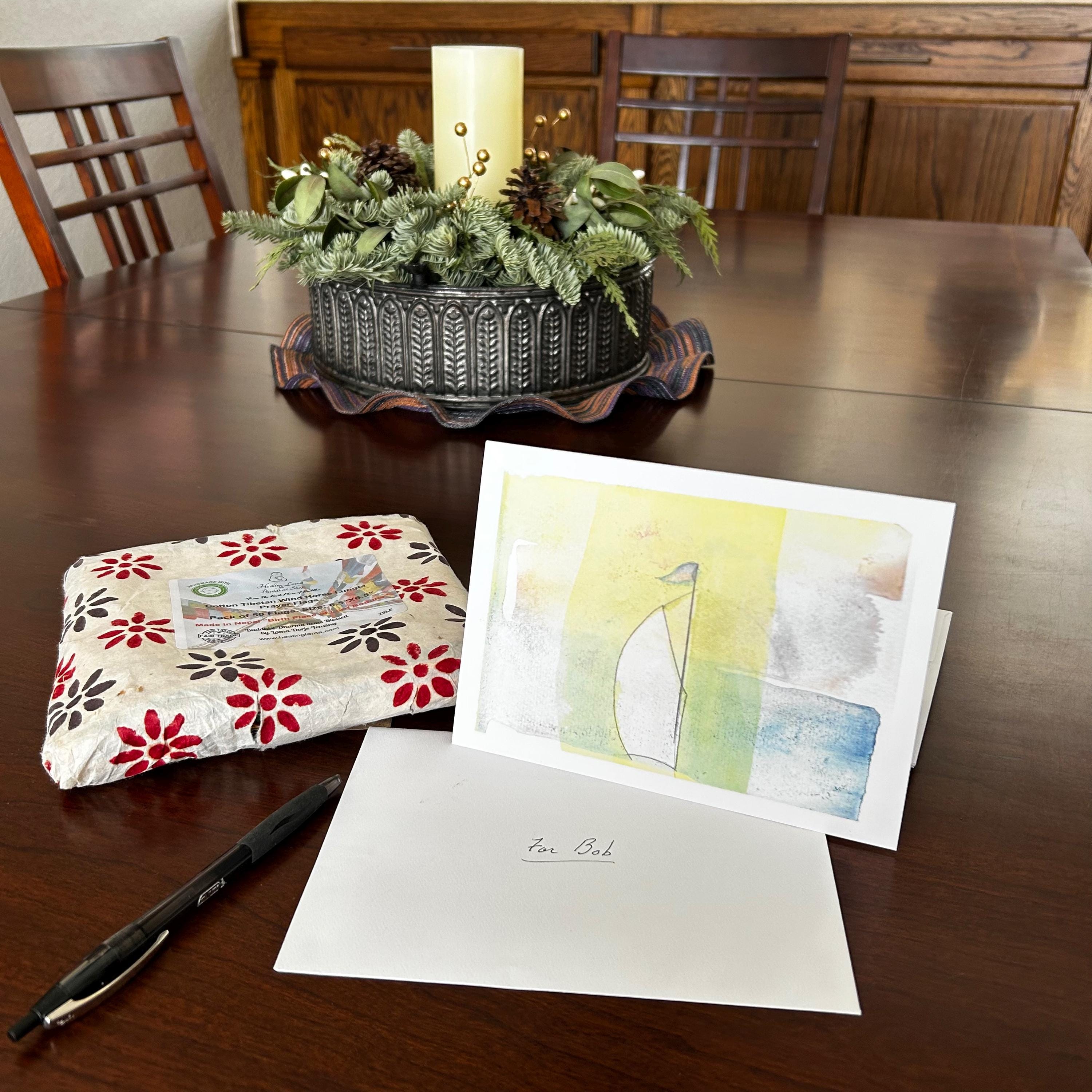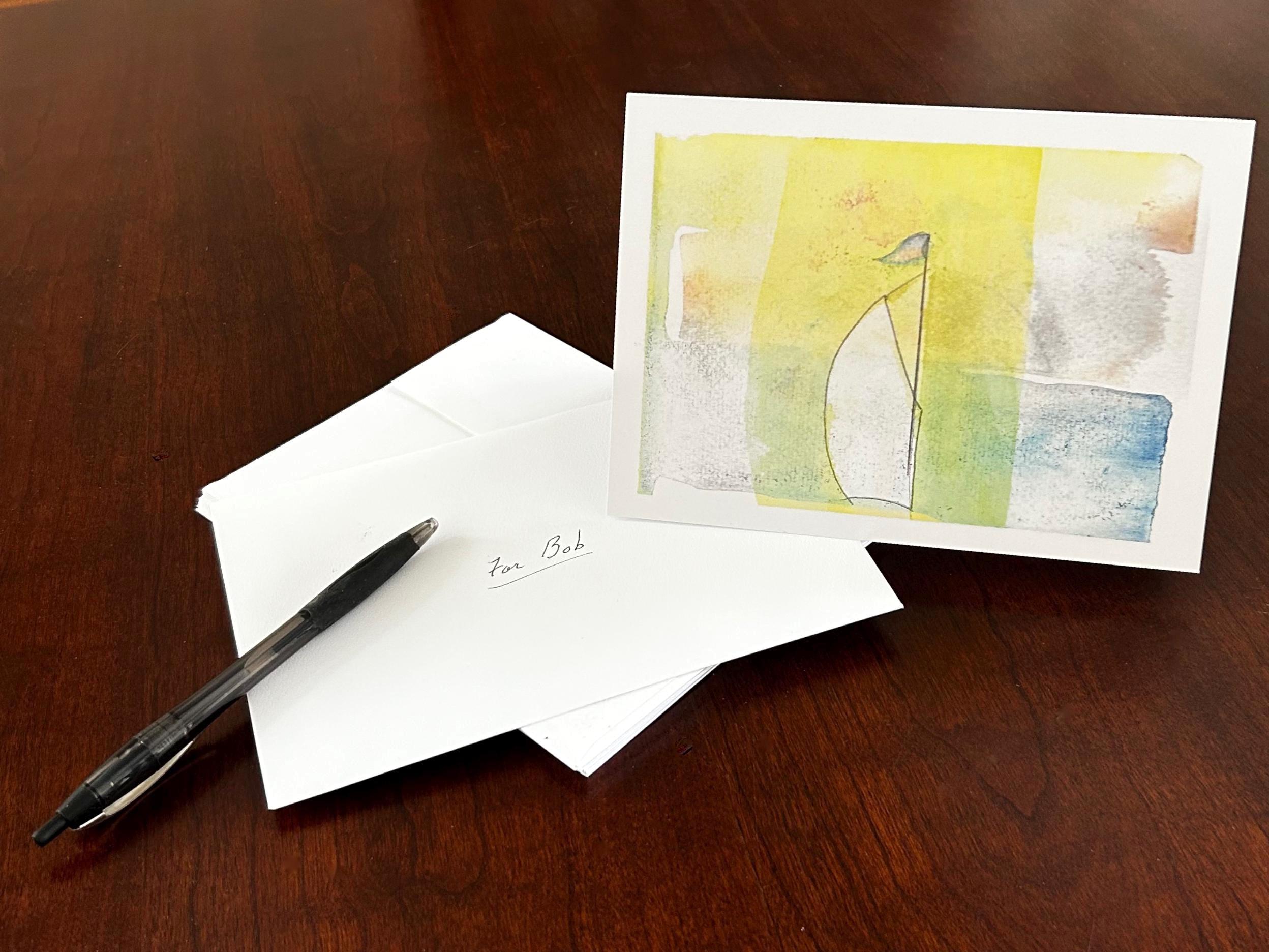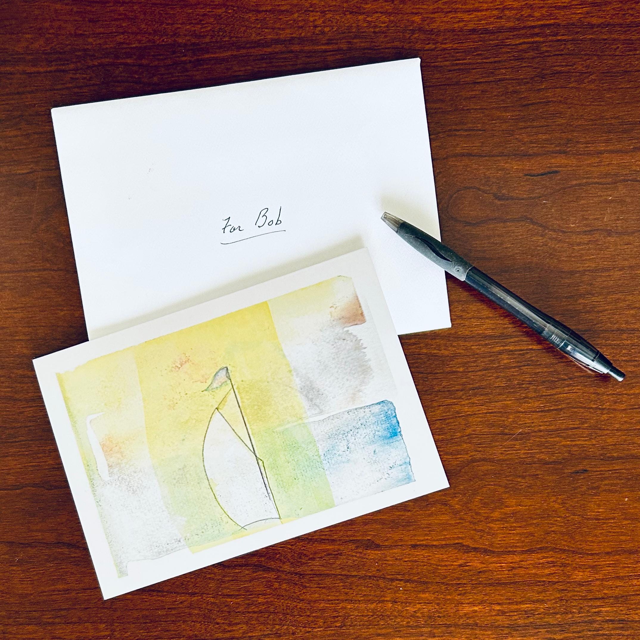 Sailboat greeting cards, $5 each or set of 6 for $28. Blank inside premium paper, matte finish, 5 x 7 inch with plain white envelopes. Professionally printed for me by Canva from the photograph of my original loose watercolor rendering in pastel hues. Entitled "Smooth Sailing"