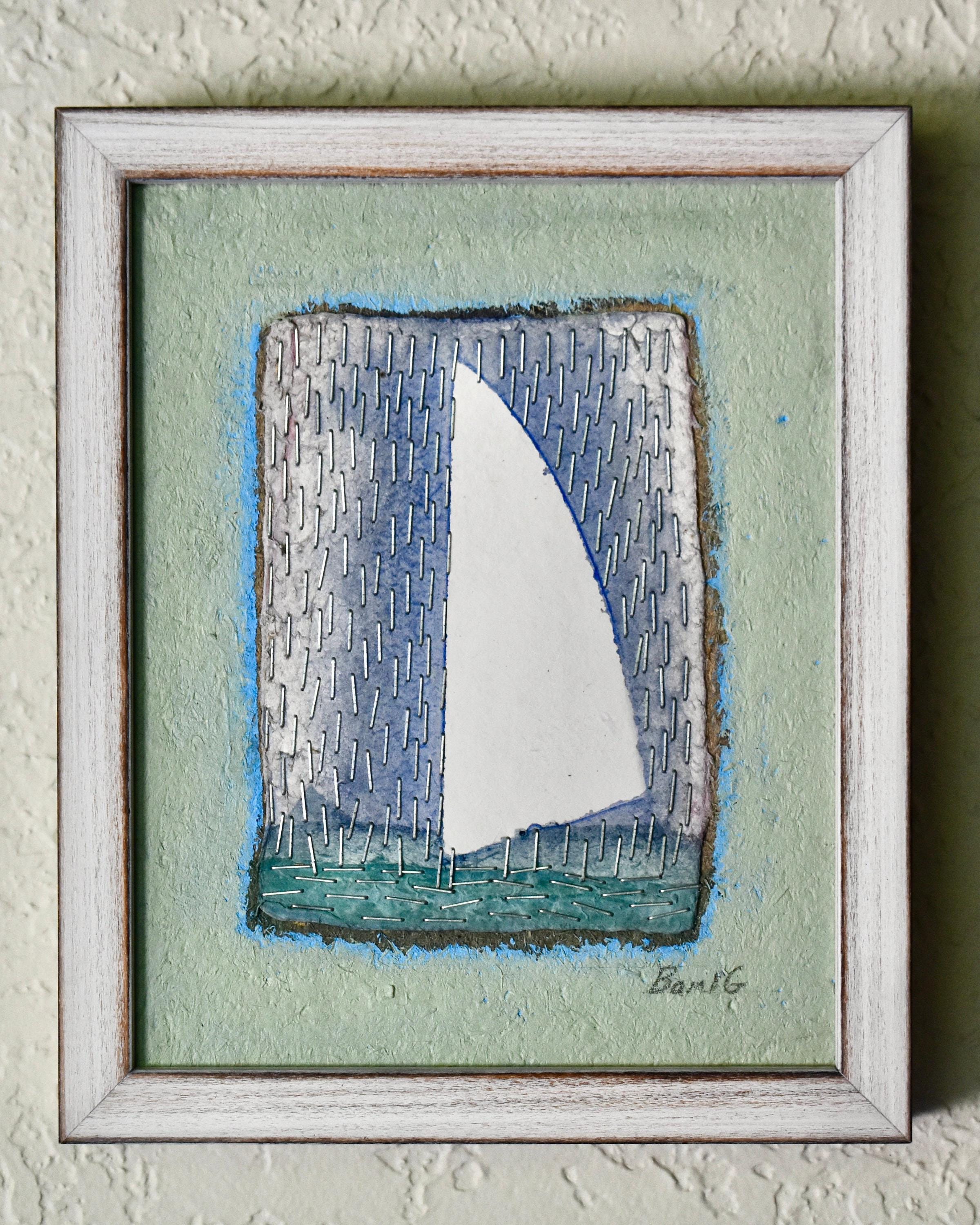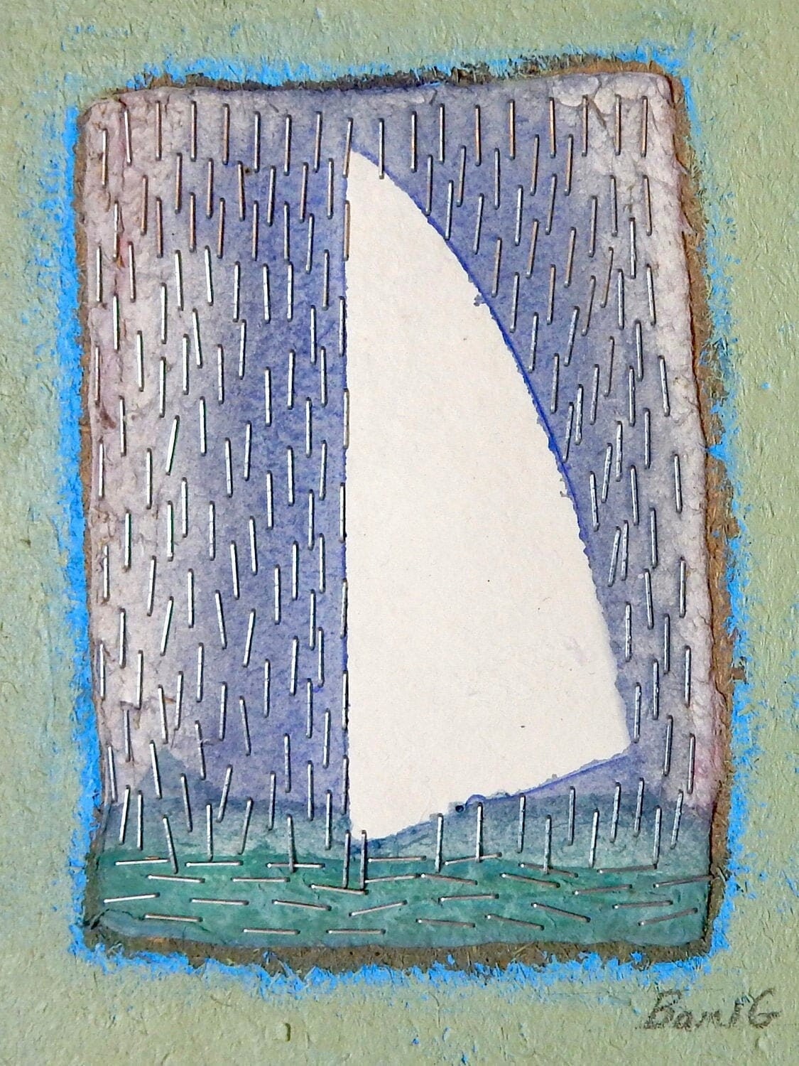 Raindrops portrayed with staples through thick paper. (Watercolor on paper and acrylic painting on particle board.) Frame measures 11.5" x 8.75"