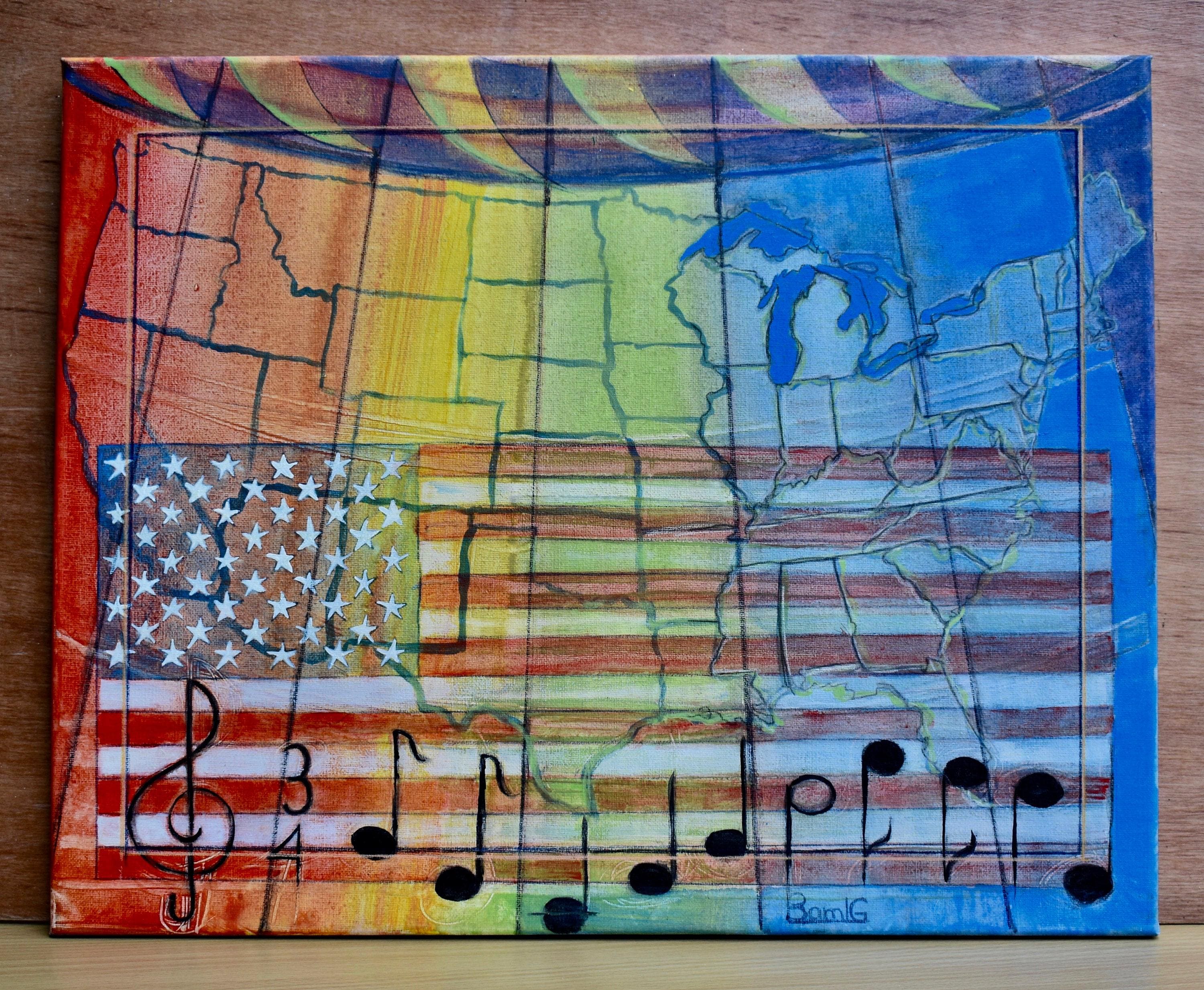 An original painting by Barbara Grant. Acrylic on canvas stretched to 16 x 20 x 1/2 inch wood frame. Musical notes from our national anthem are painted onto the stripes of the American flag with a full spectrum color wheel across a map of the United States.